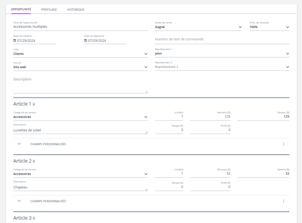 Ce nouveau filtre est aussi disponible dans le module Opportunités afin de rechercher une opportunité qui contient un représentant spécifique et ce, sans distinction s'il en est le représentant 1 ou 2.