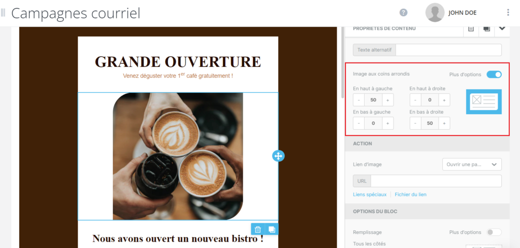 Dans l'éditeur de courriel, il est maintenant possible d'arrondir les coins des images pour obtenir un design plus raffiné.