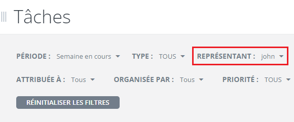 Dans le module Tâches, il est maintenant possible de rechercher une tâche qui contient un représentant spécifique et ce, sans distinction s'il est assigné à la tâche ou en est l'organisateur.